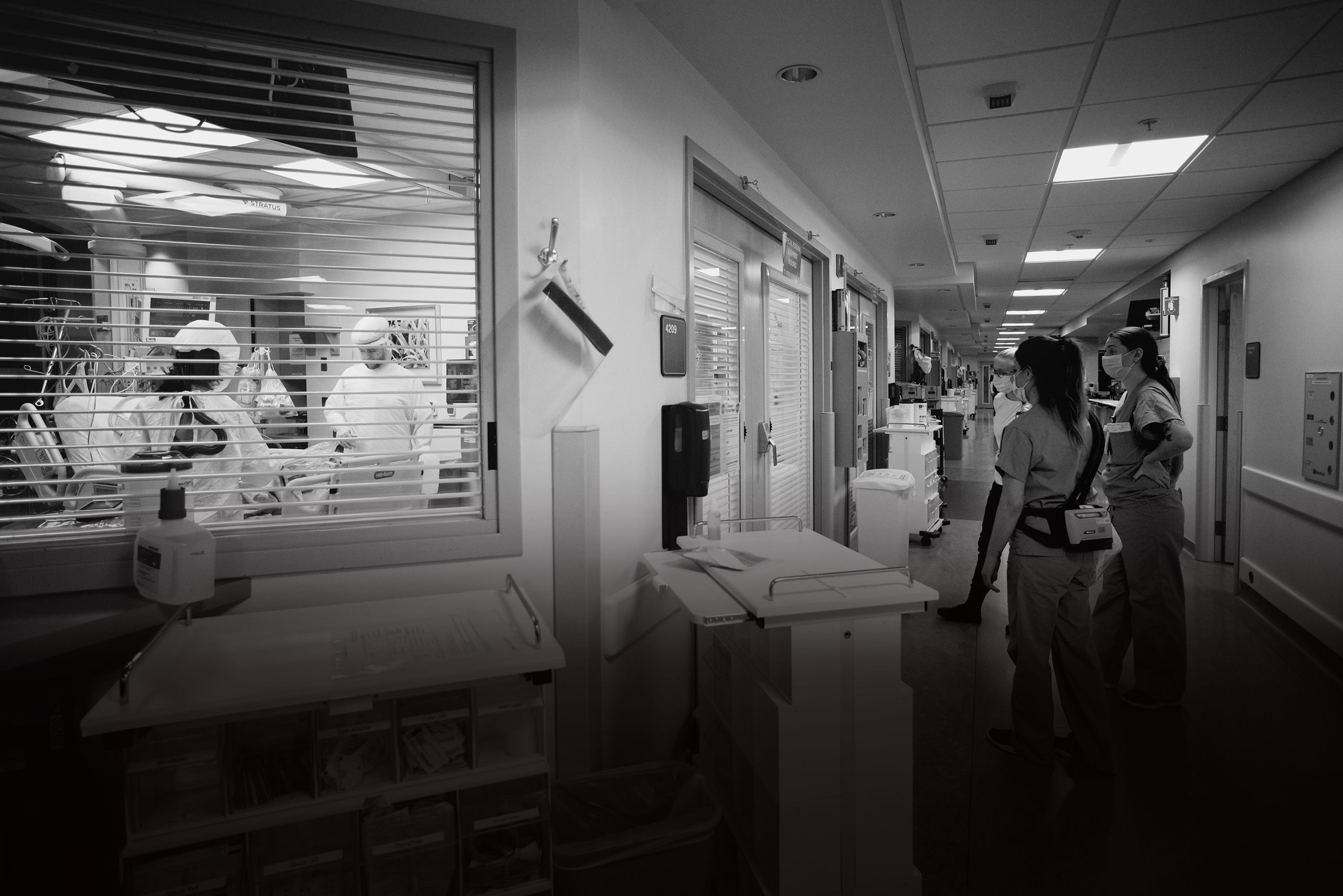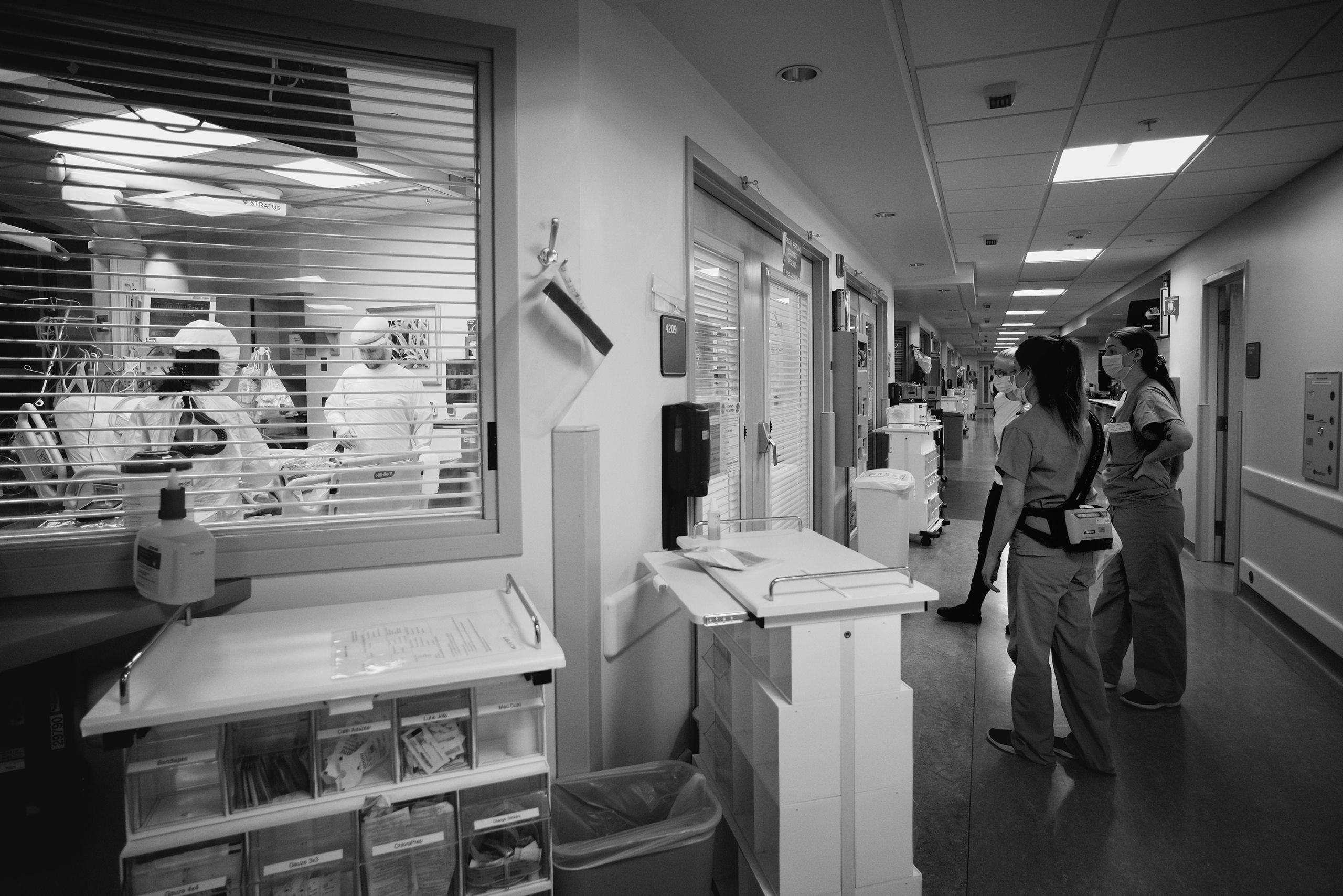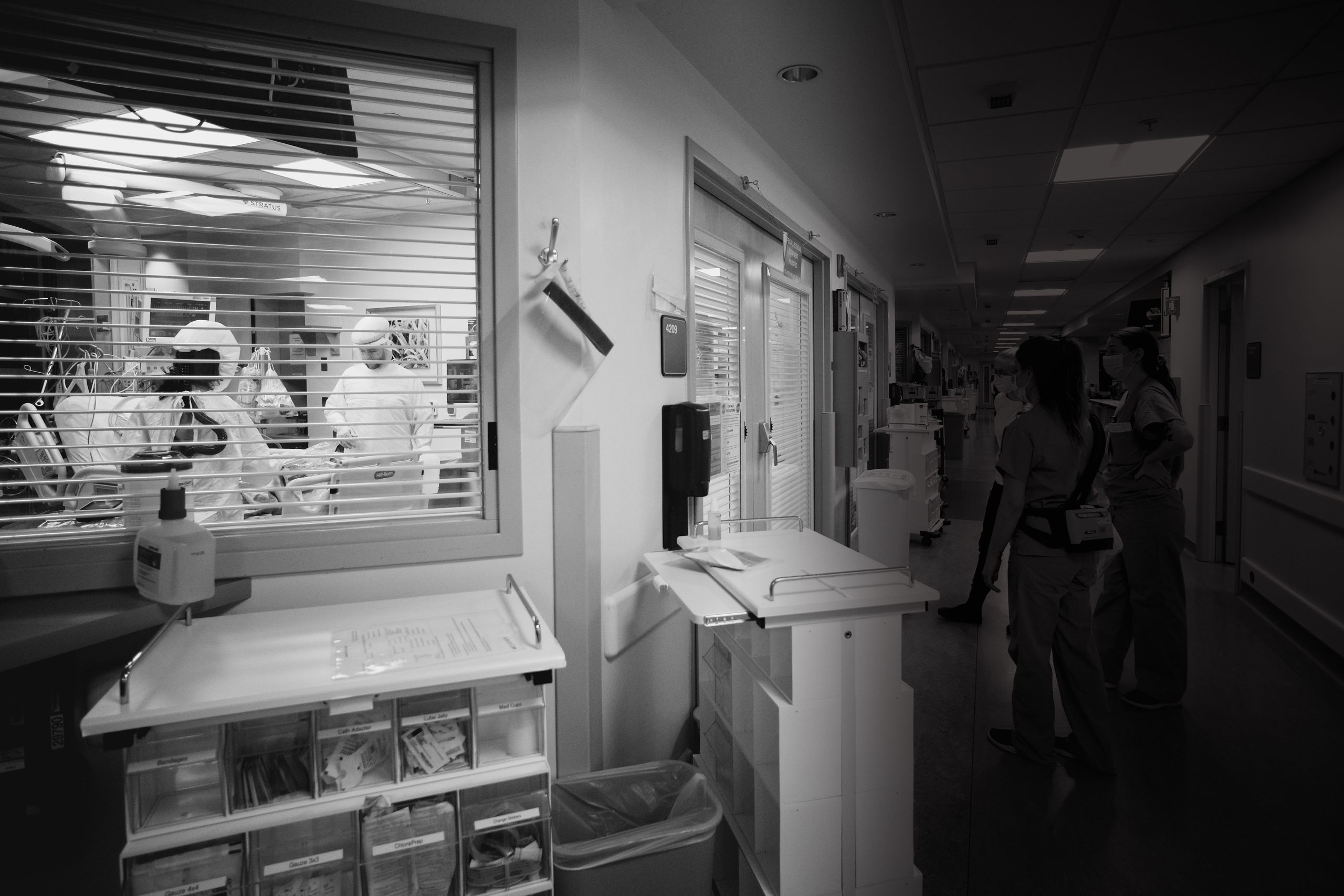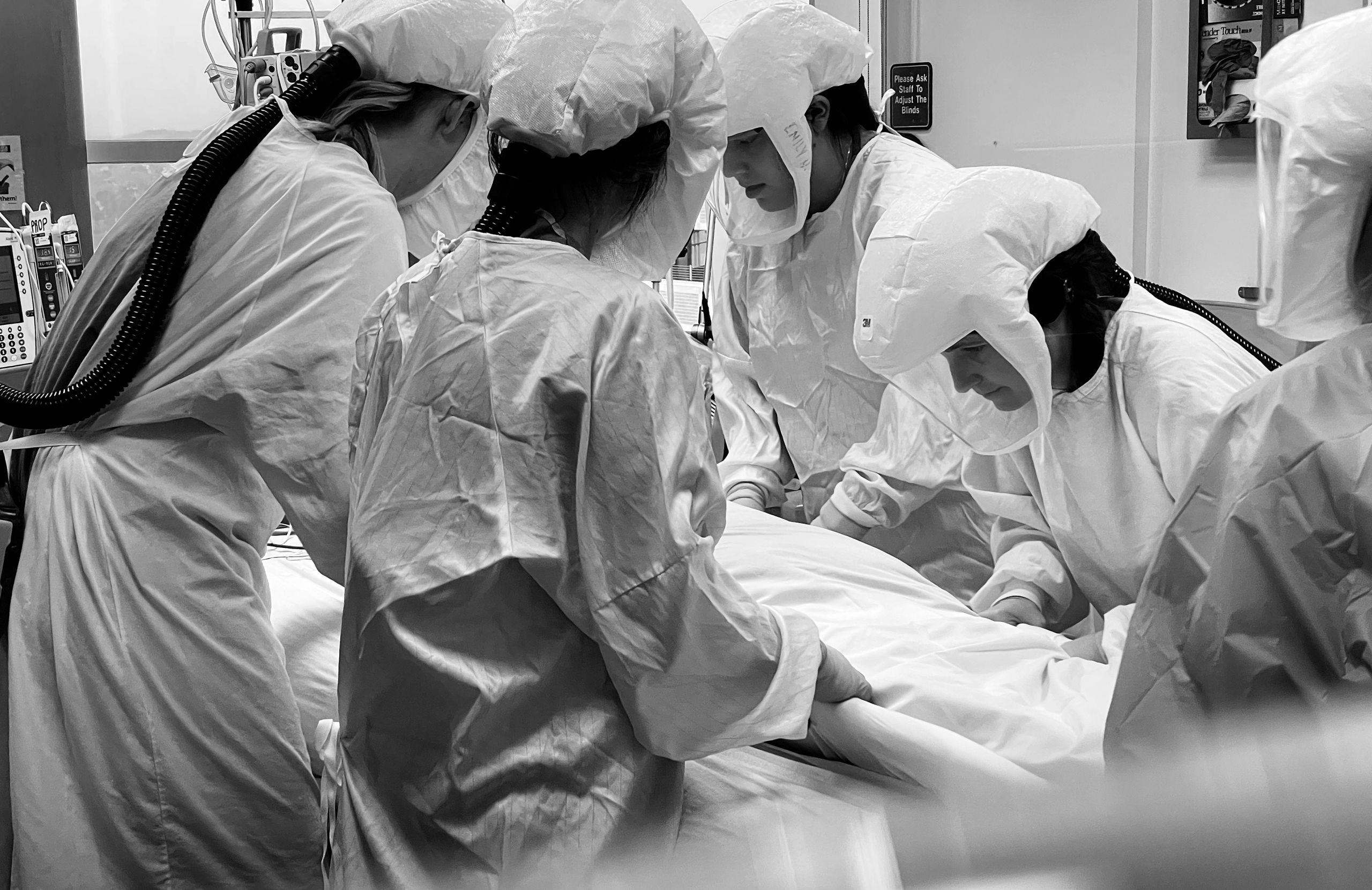 There’s a line the unit holds—between clean and dirty, infectious and non-infectious. Nurses in PAPRs care for a patient while others stand poised outside, ready to run in and help at a moment' s notice.