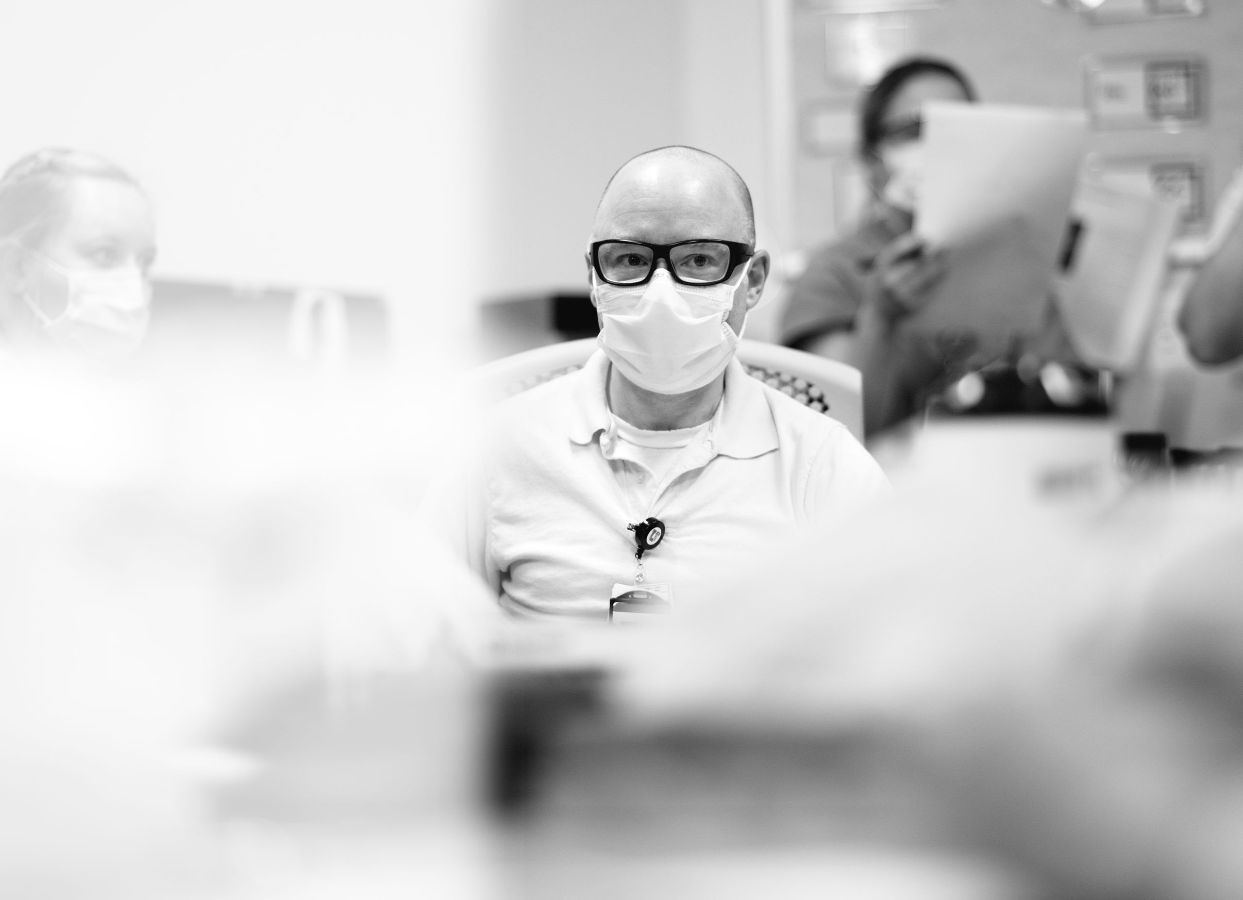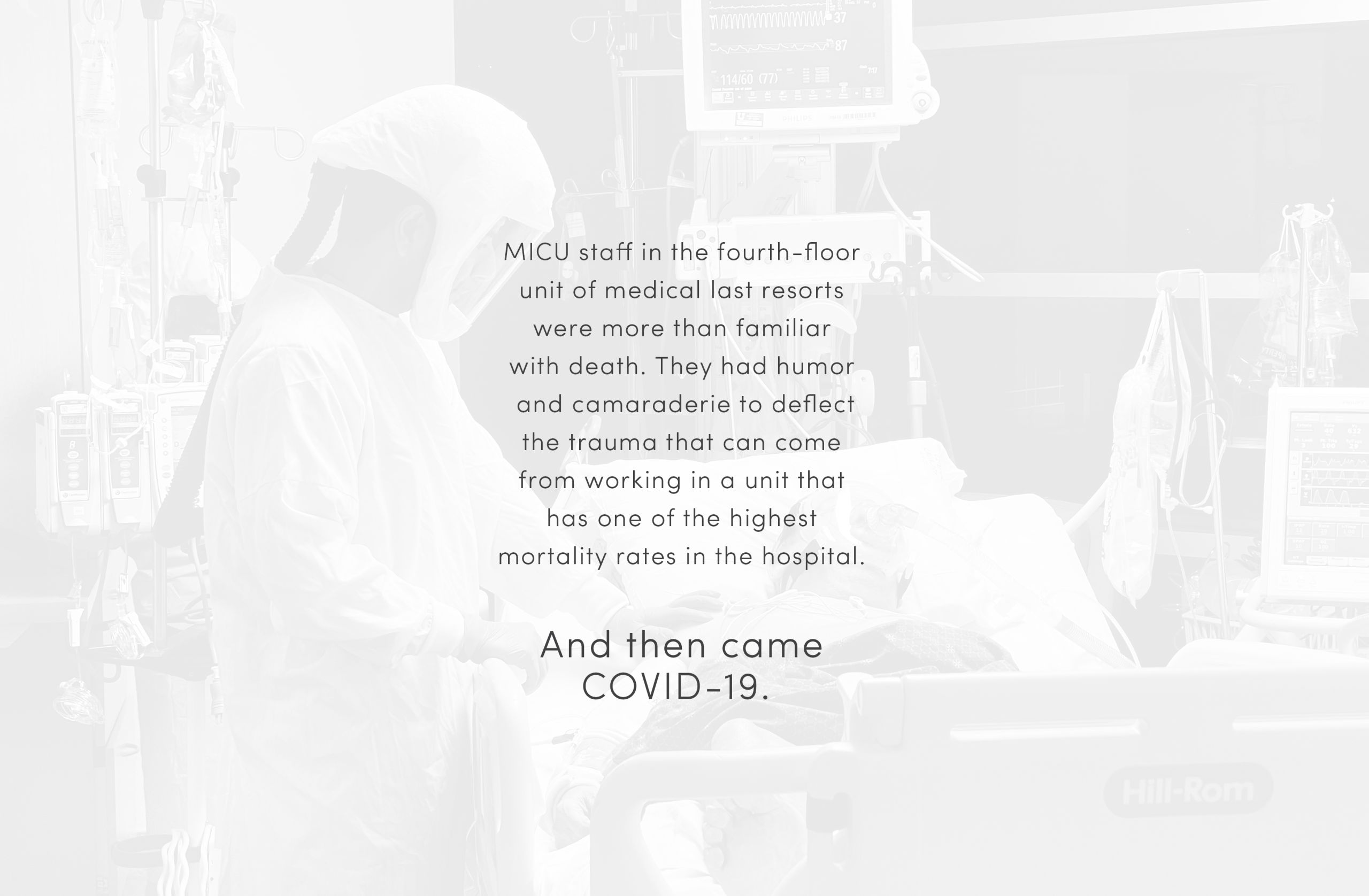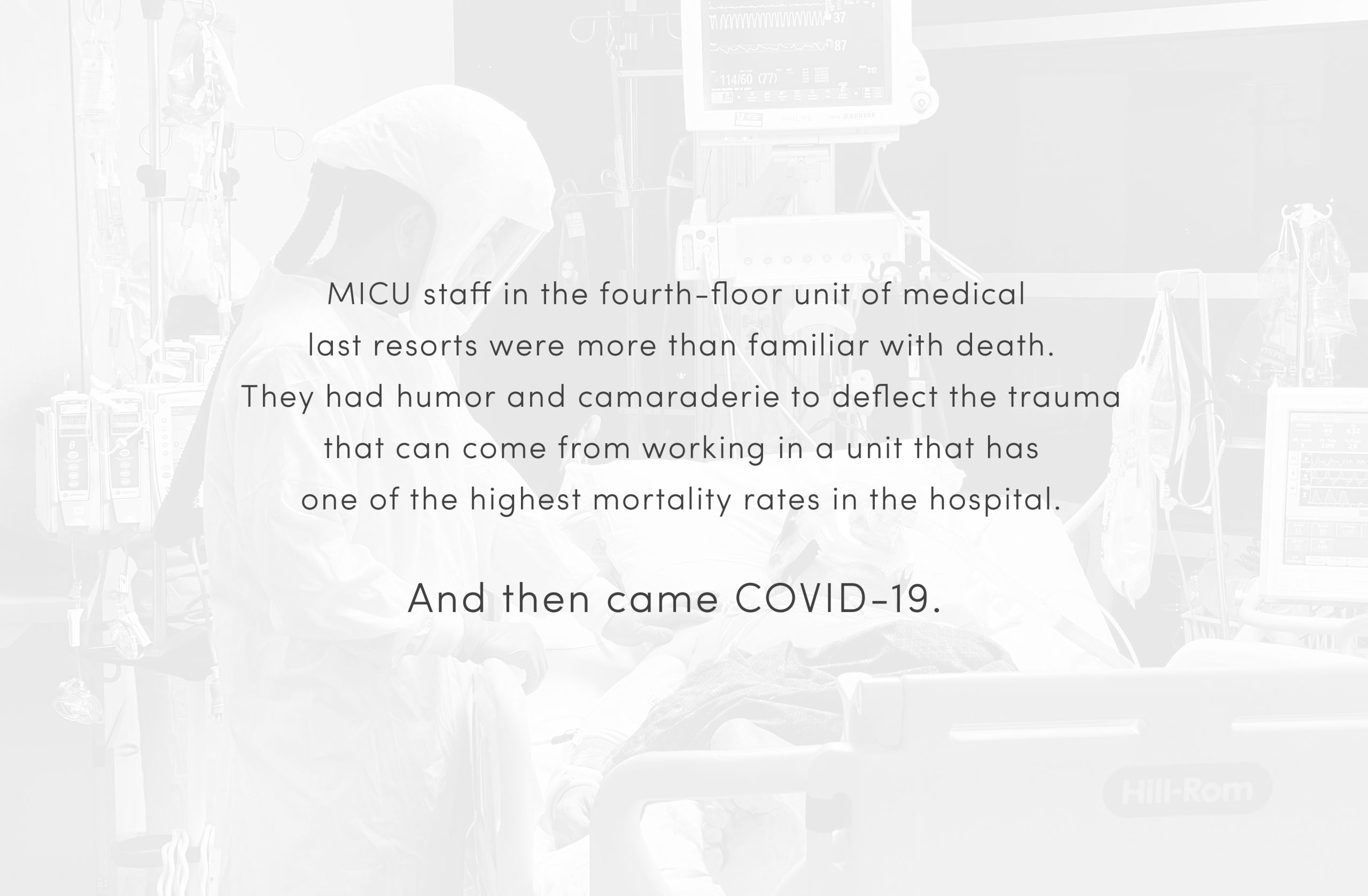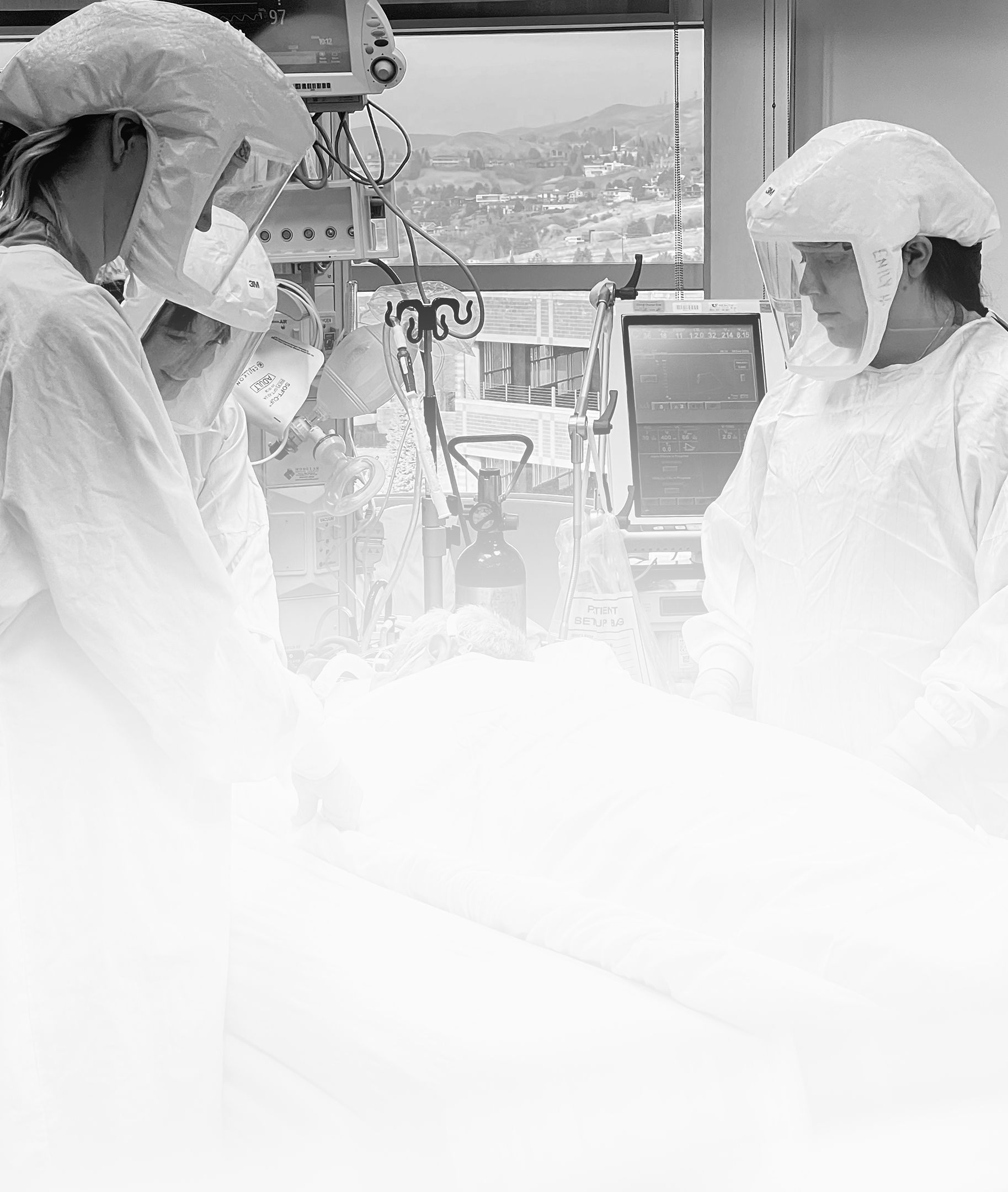 There’s a line the unit holds—between clean and dirty, infectious and non-infectious. Nurses in PAPRs care for a patient while others stand poised outside, ready to run in and help at a moment' s notice.