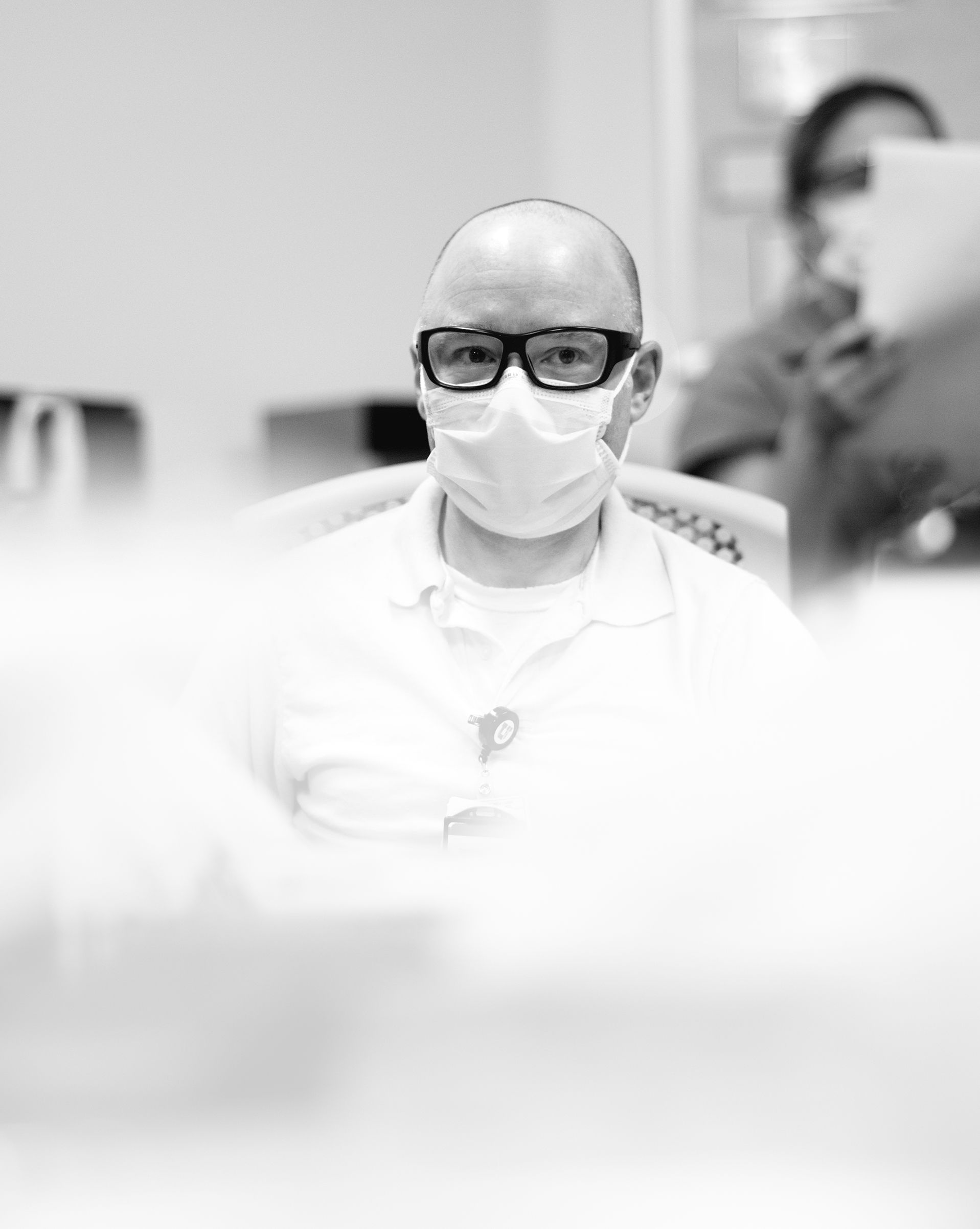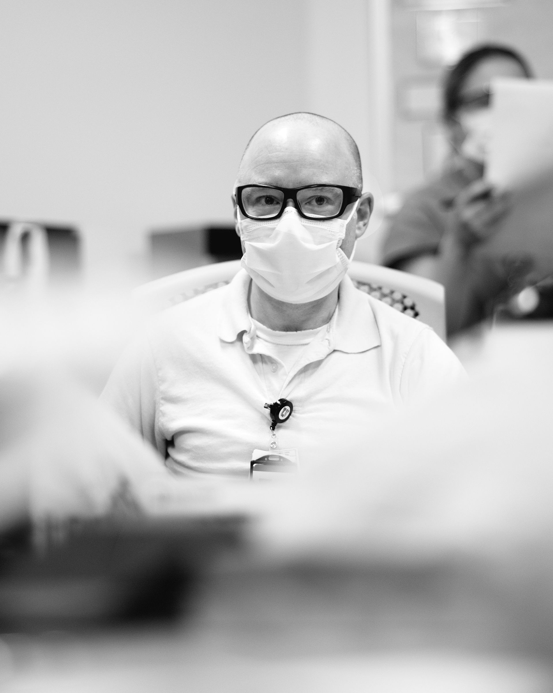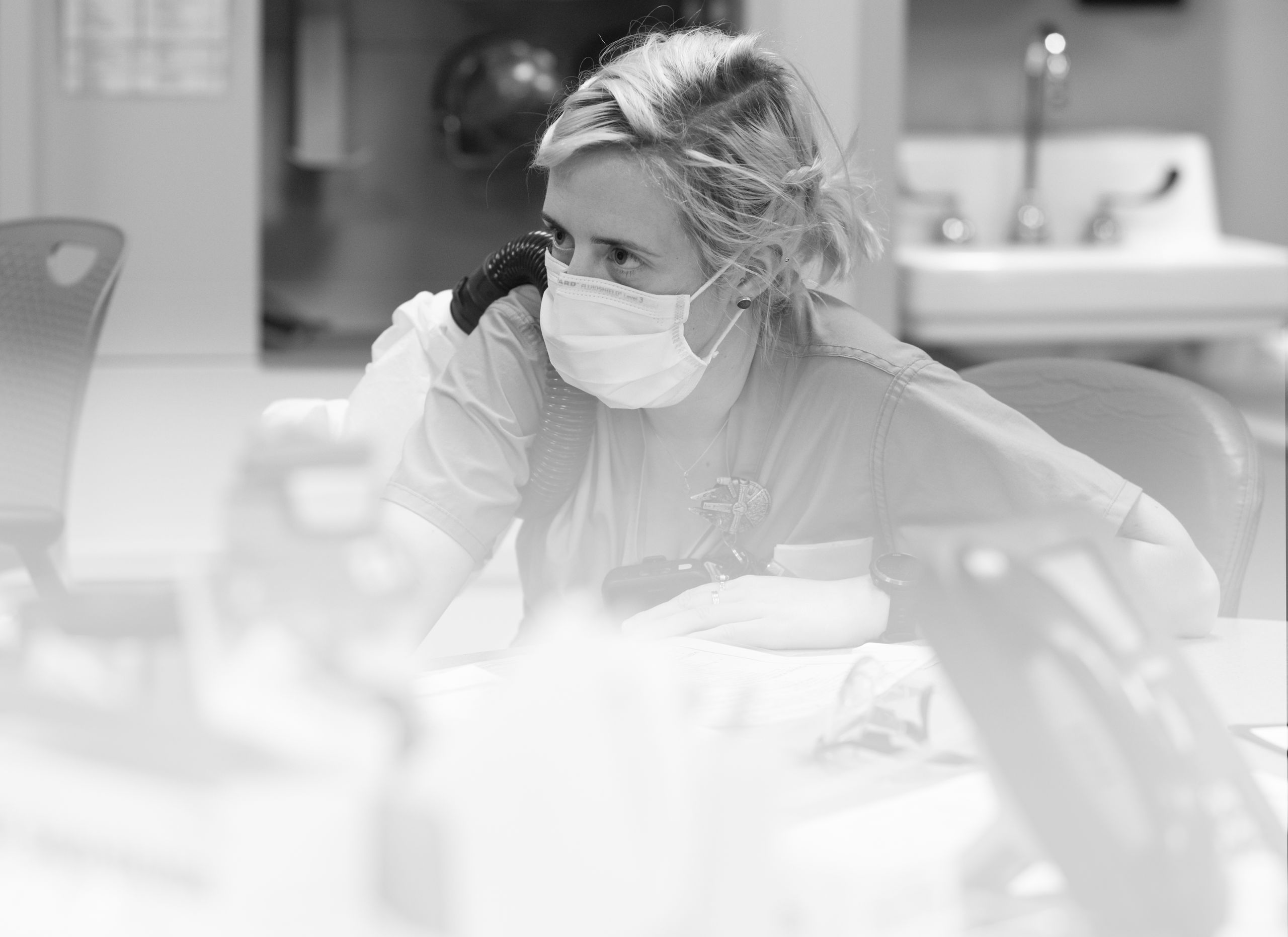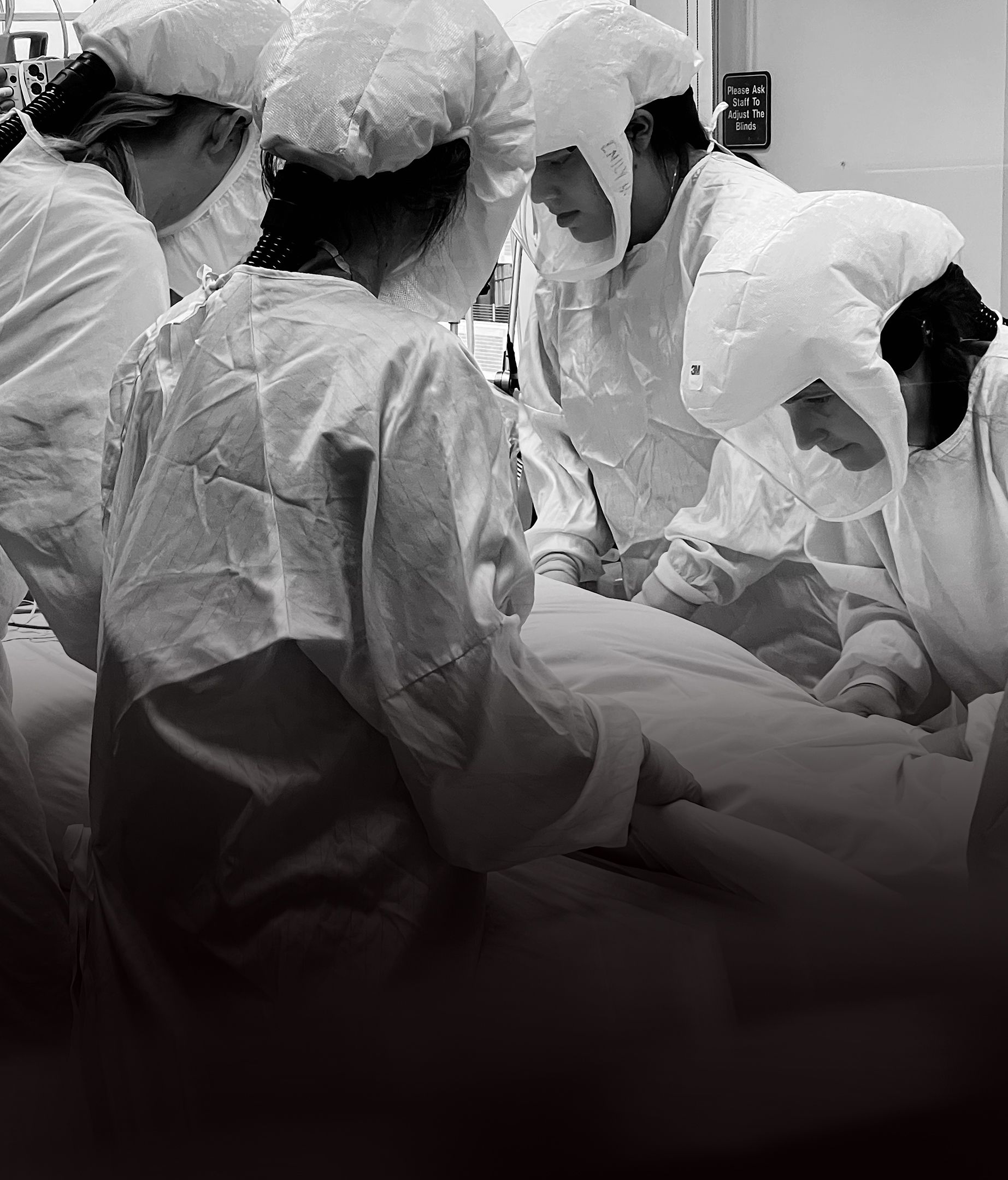 There’s a line the unit holds—between clean and dirty, infectious and non-infectious. Nurses in PAPRs care for a patient while others stand poised outside, ready to run in and help at a moment' s notice.