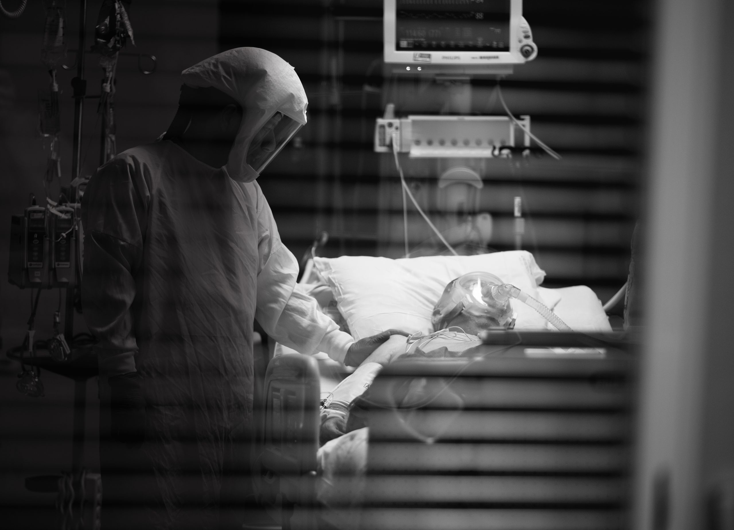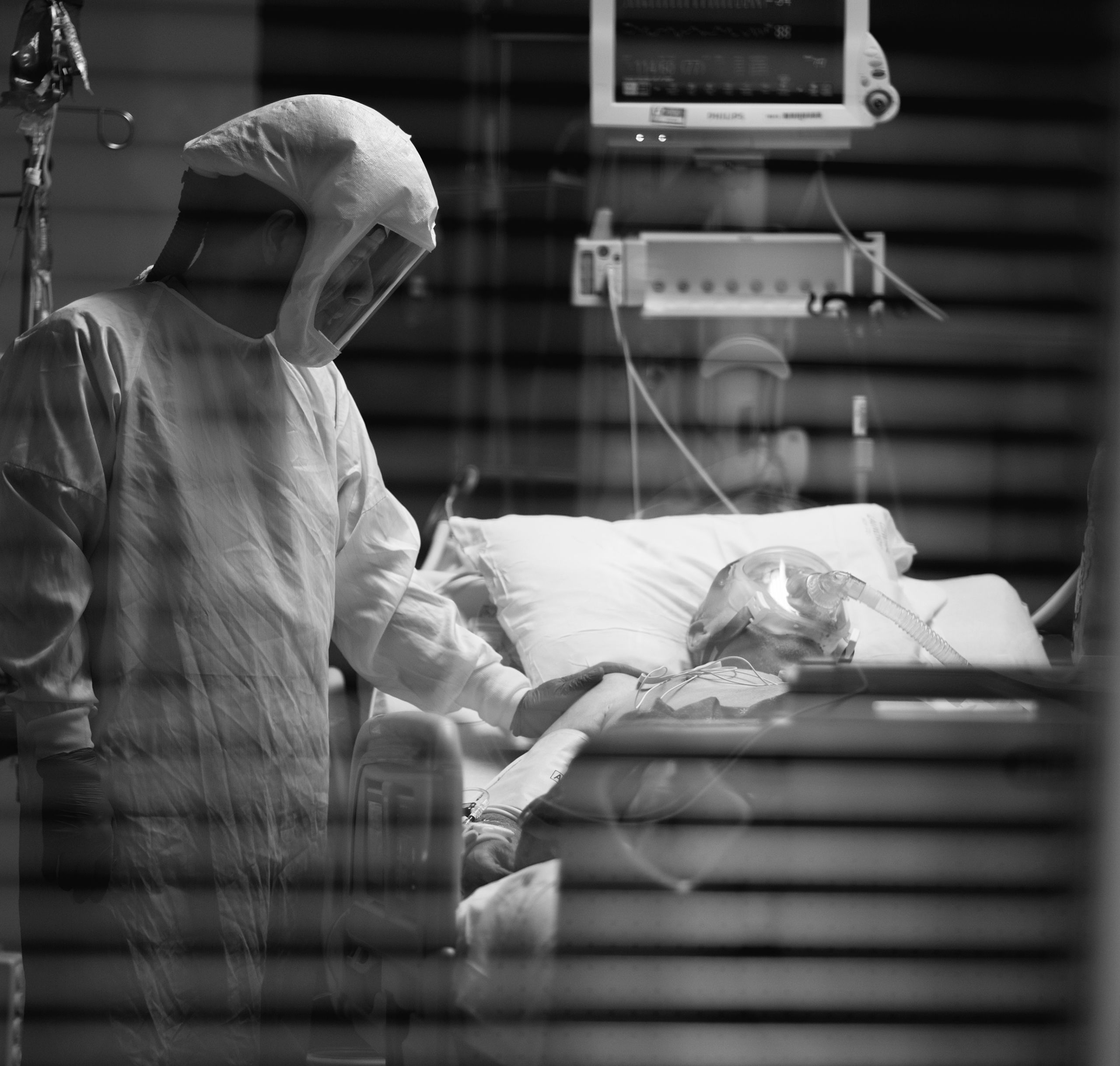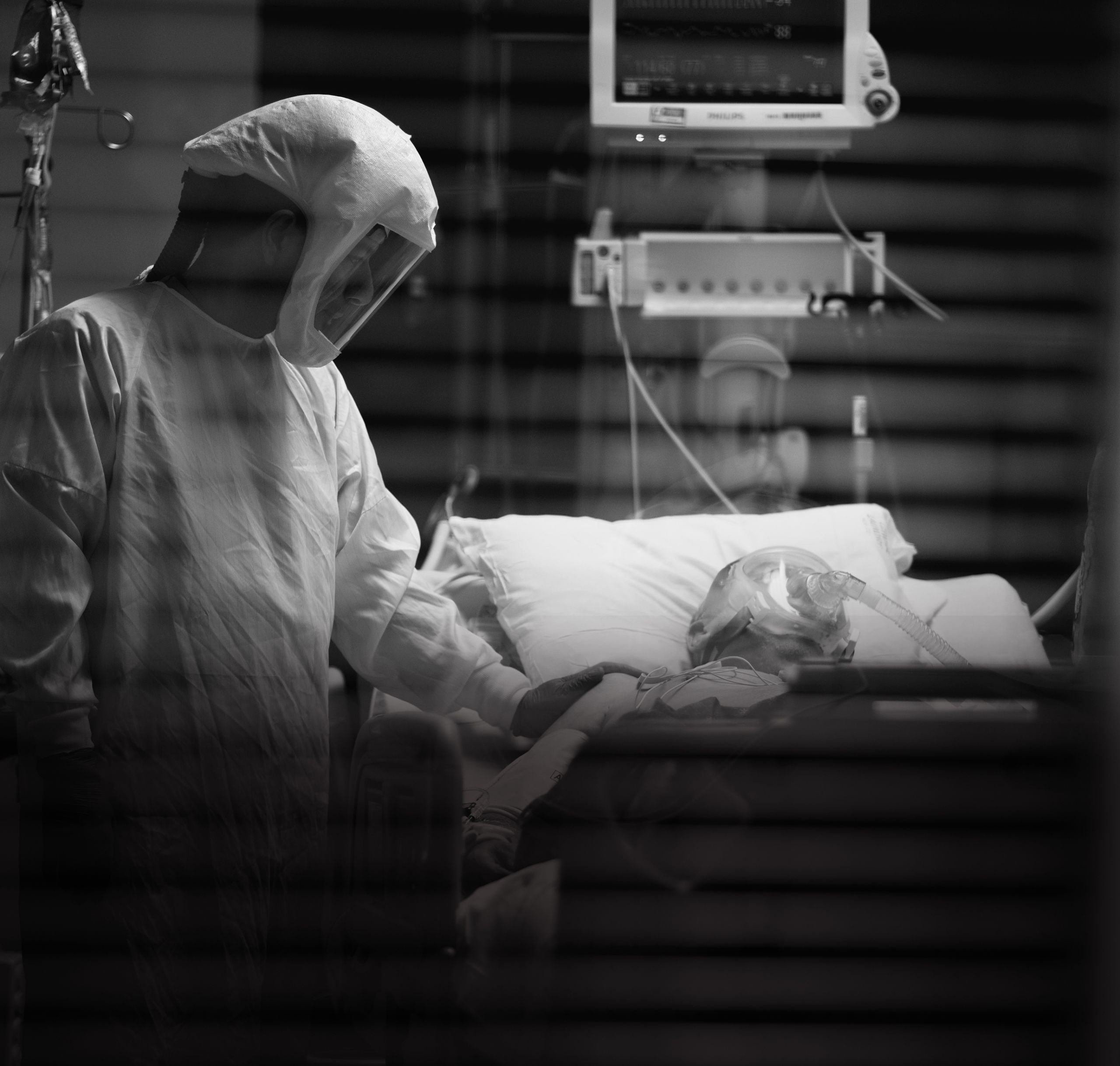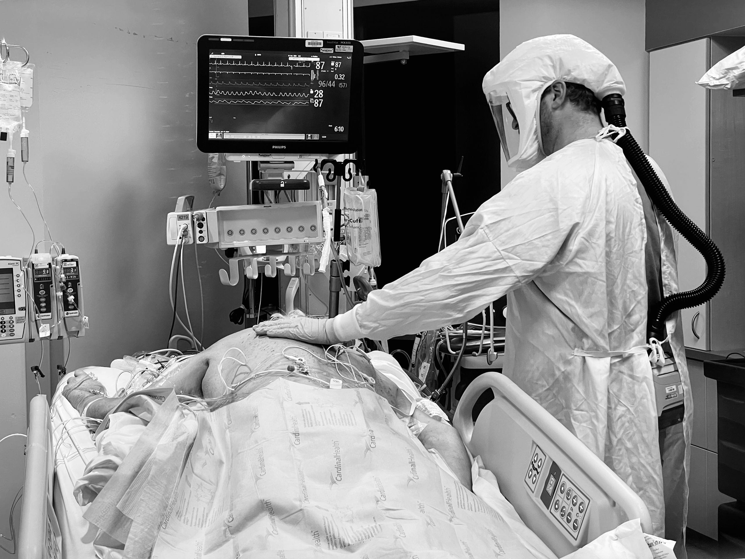 Hooked up to so many machines, the patient is naked, flipped on their belly, their very humanity in so many senses all but denied. A nurse takes a moment to simply connect with a patient. He touches their back with his plastic-gloved hand, conveying—whether they can feel it through the fog of drugs or not—an essential message.