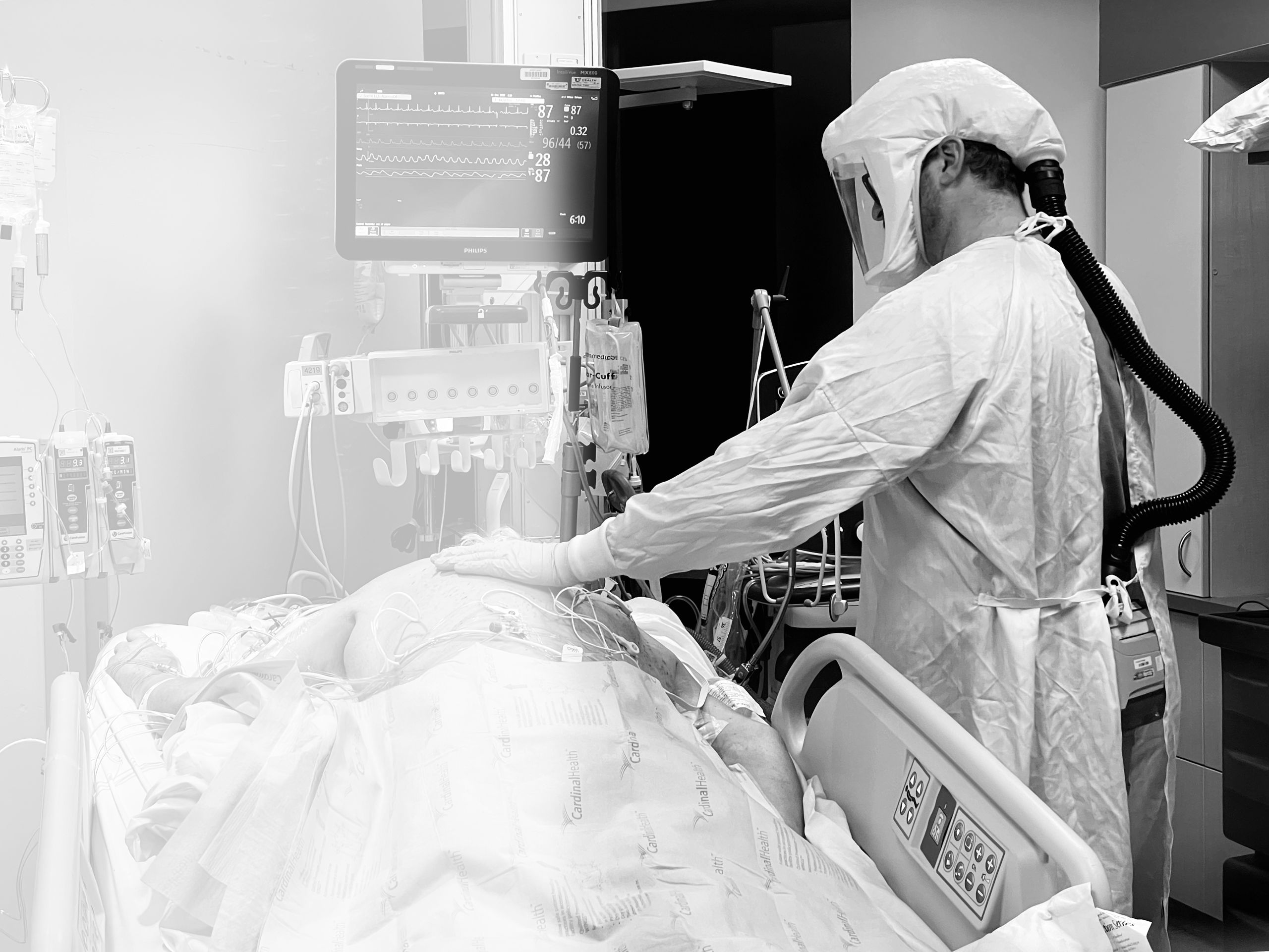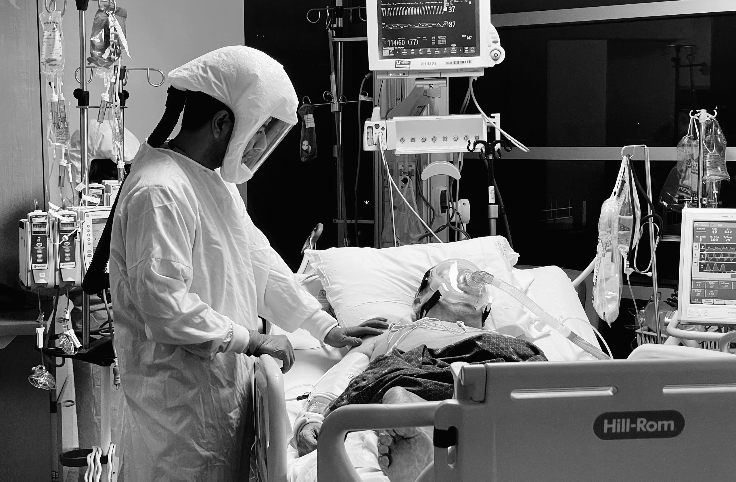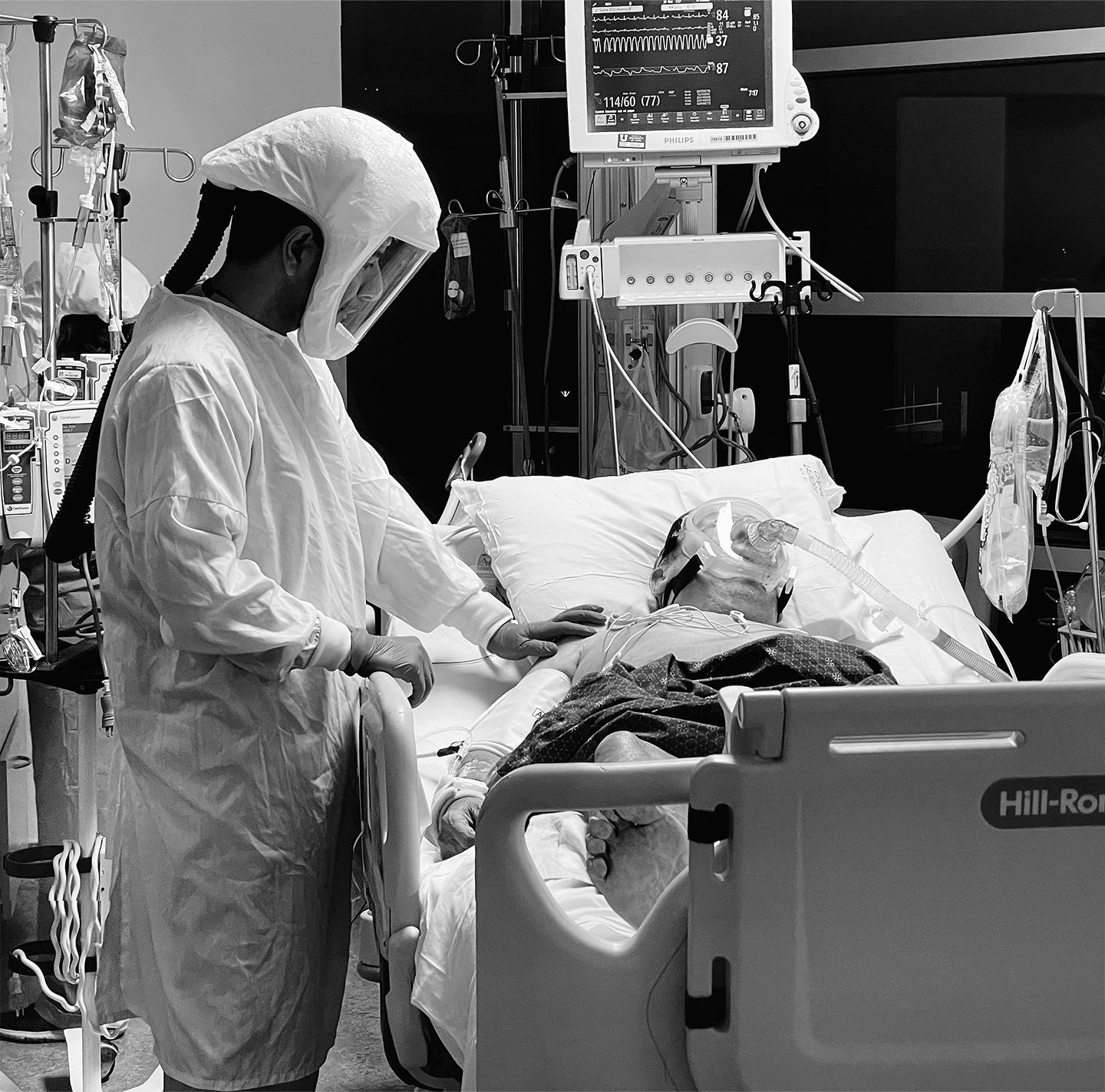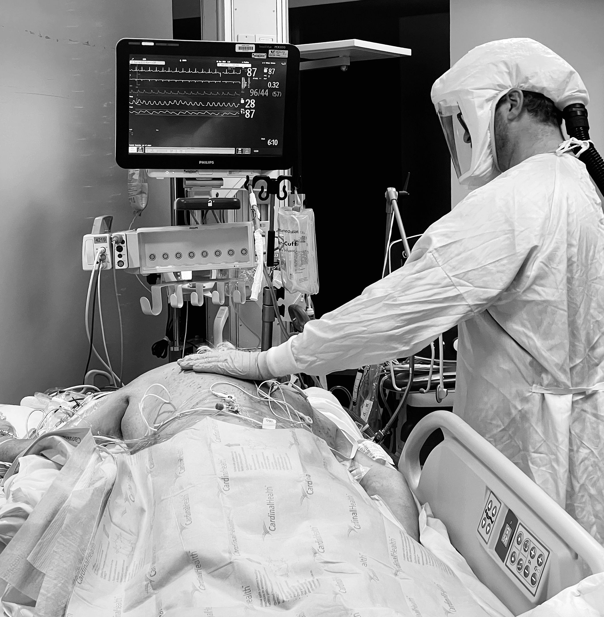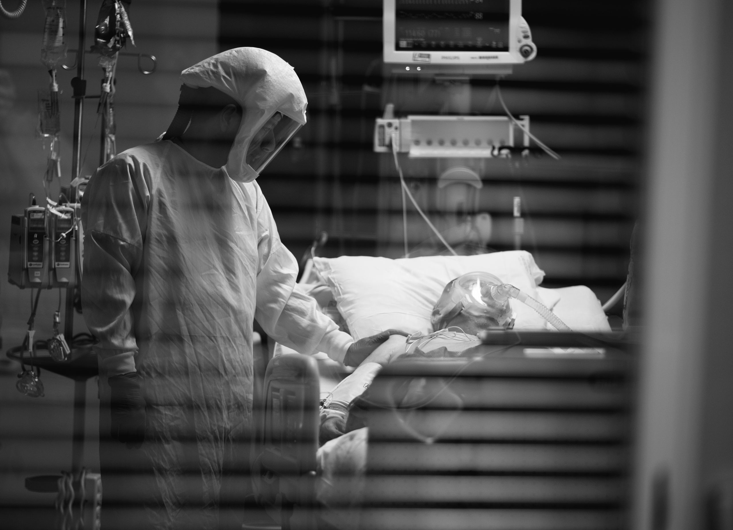 Hooked up to so many machines, the patient is naked, flipped on their belly, their very humanity in so many senses all but denied. A nurse takes a moment to simply connect with a patient. He touches their back with his plastic-gloved hand, conveying—whether they can feel it through the fog of drugs or not—an essential message.
