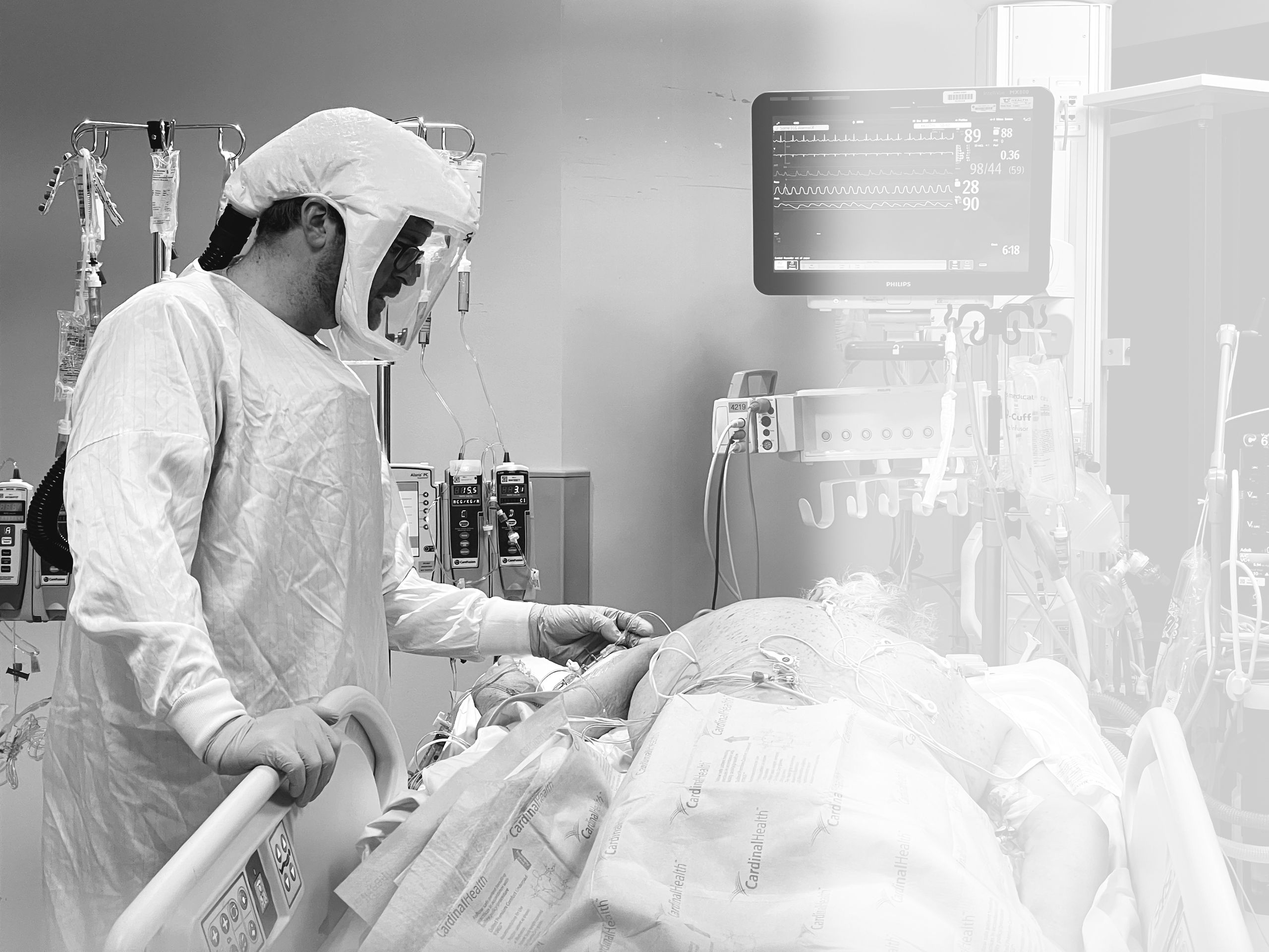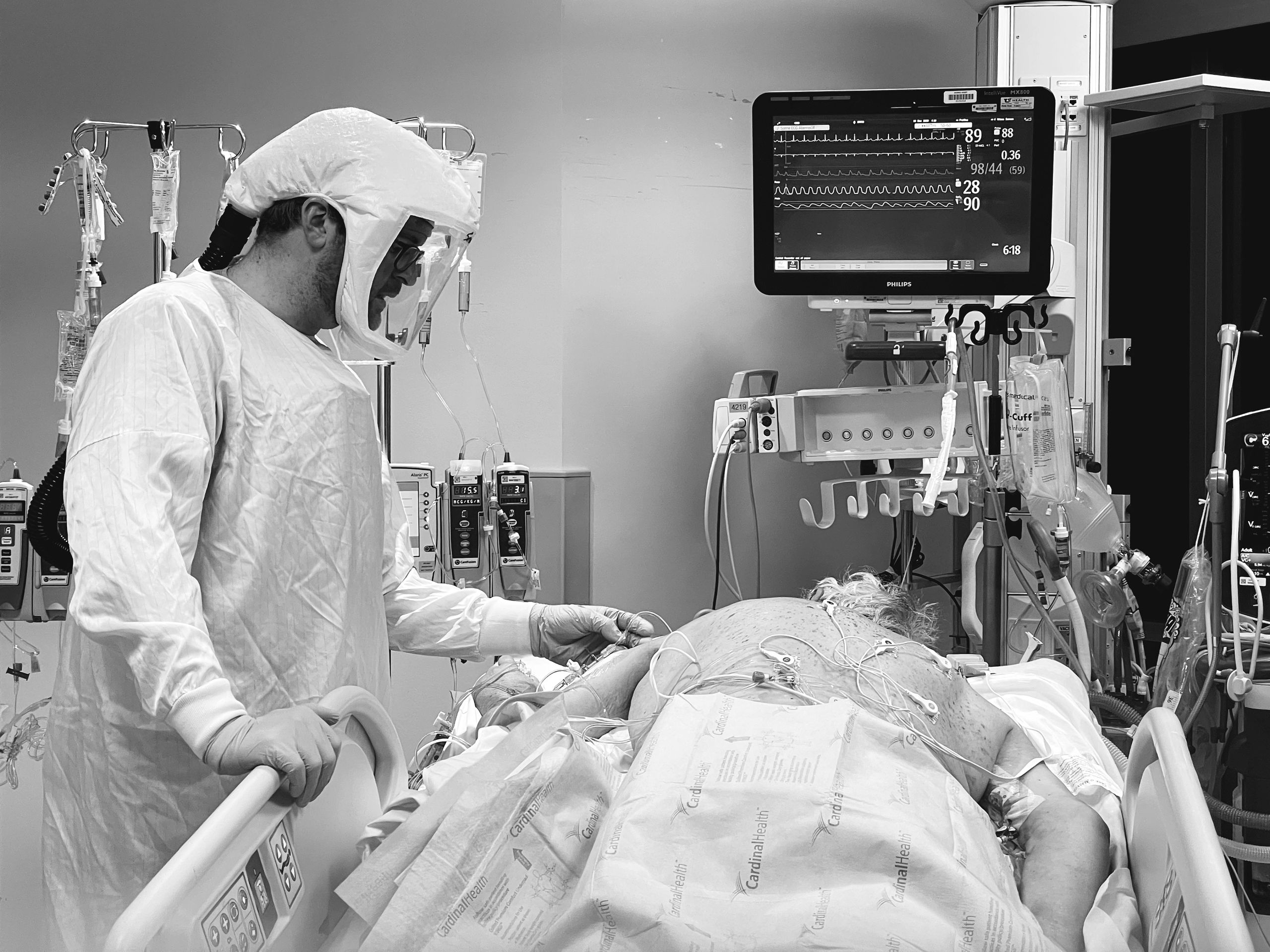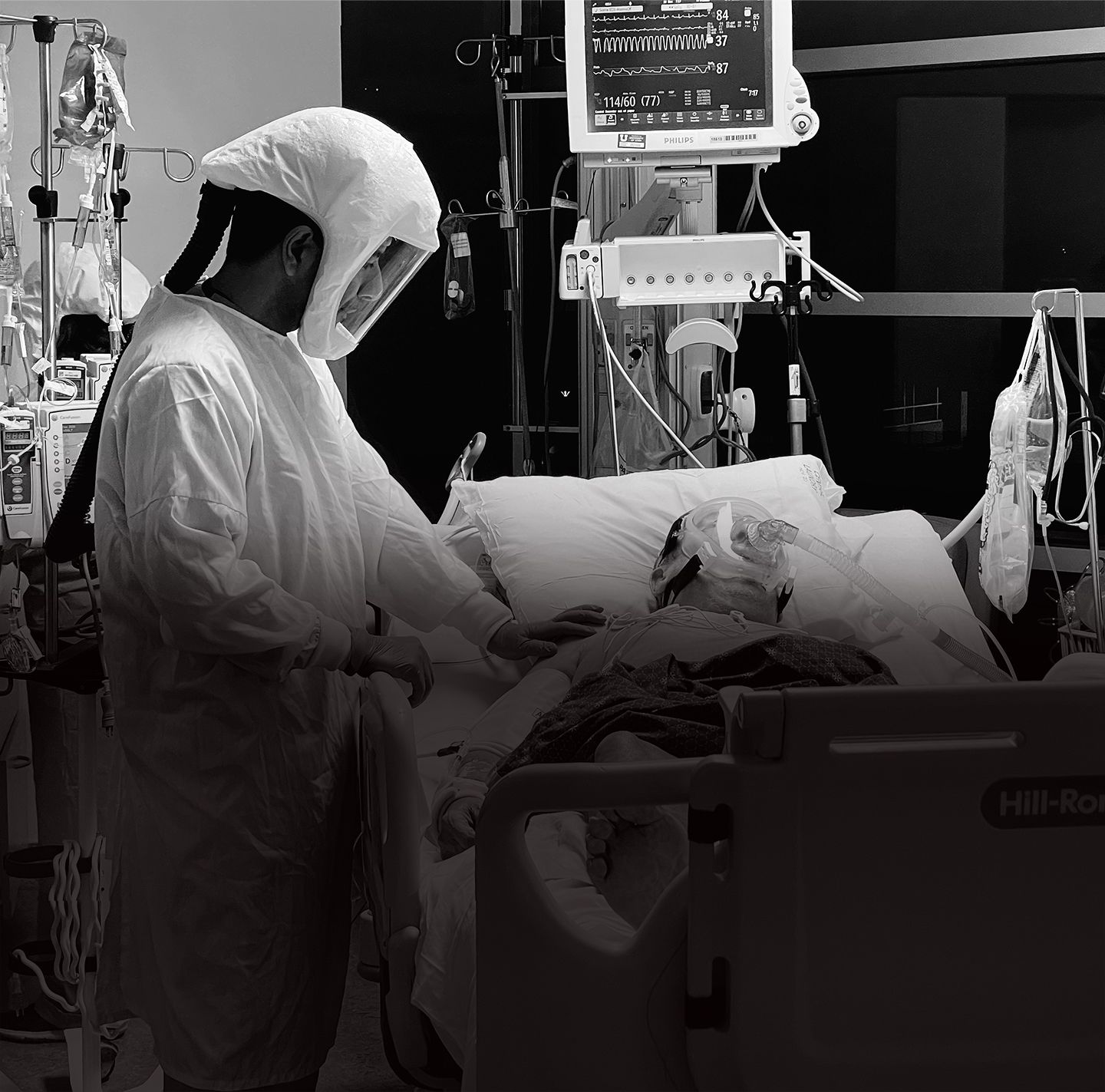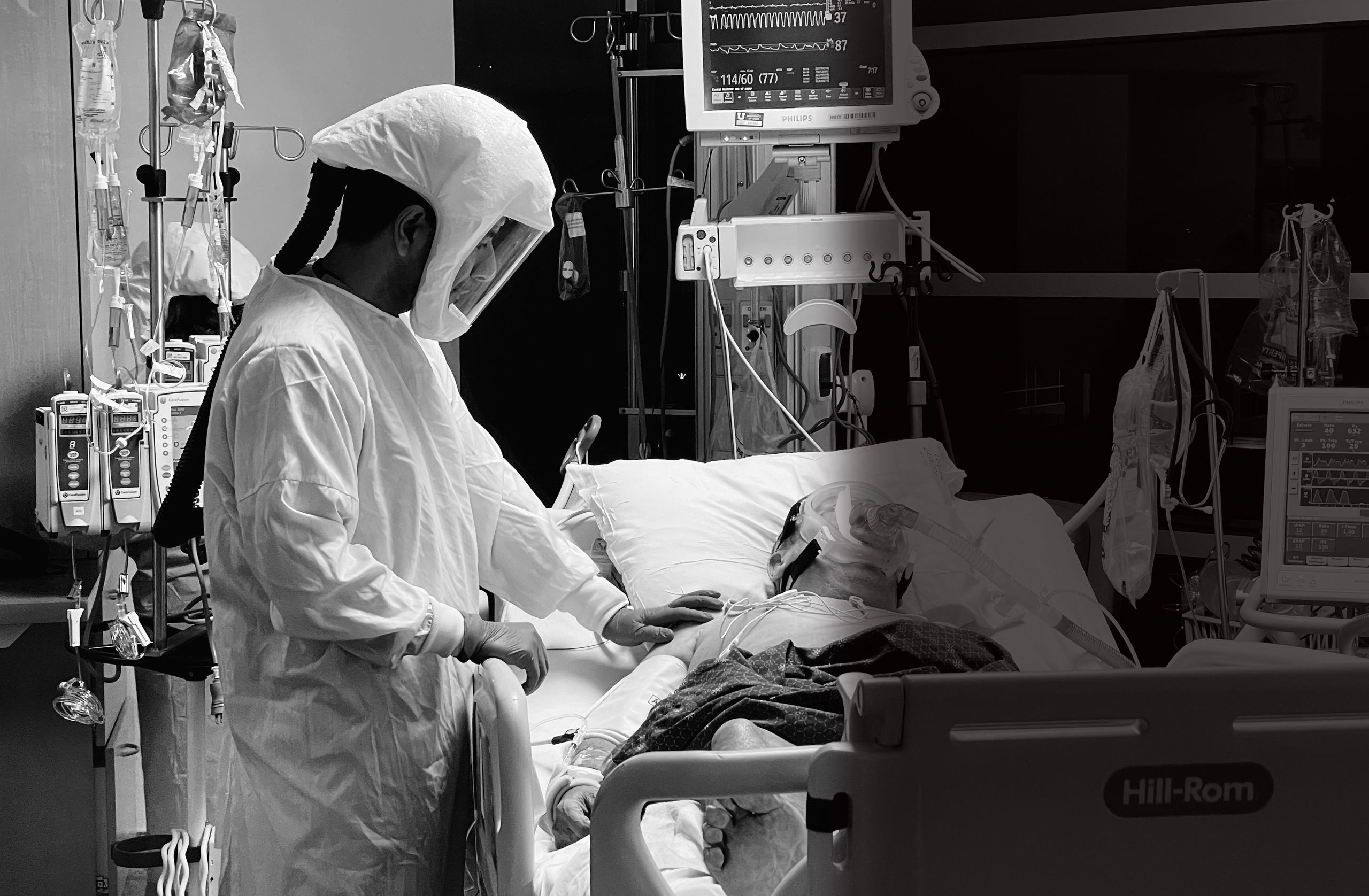 Hooked up to so many machines, the patient is naked, flipped on their belly, their very humanity in so many senses all but denied. A nurse takes a moment to simply connect with a patient. He touches their back with his plastic-gloved hand, conveying—whether they can feel it through the fog of drugs or not—an essential message.