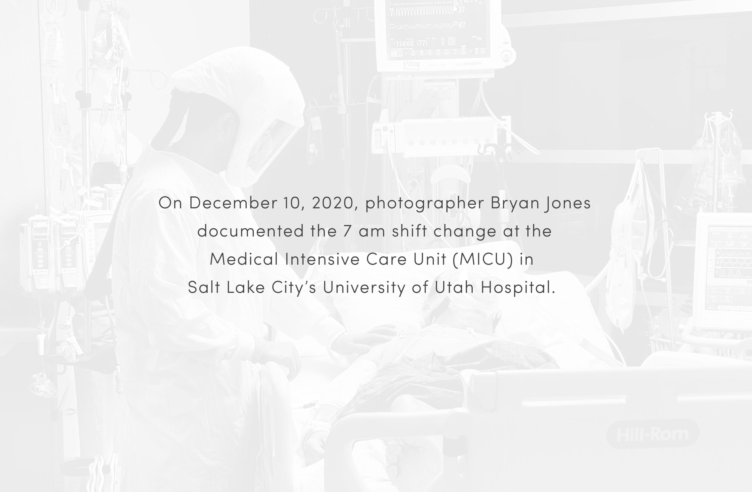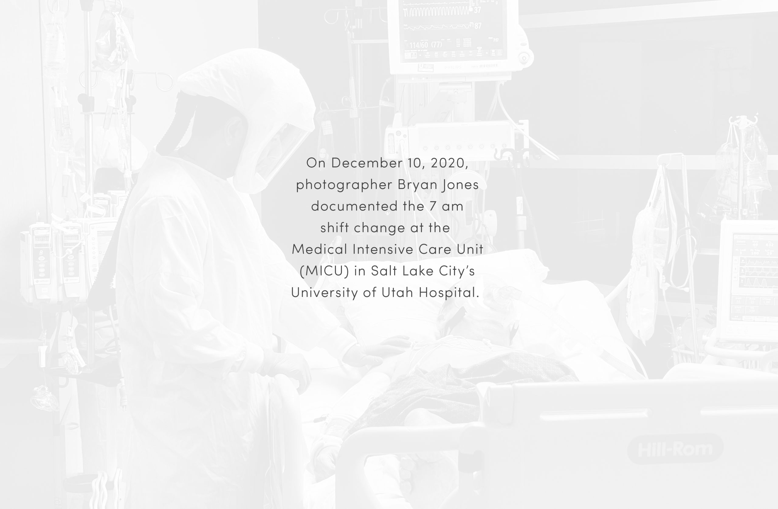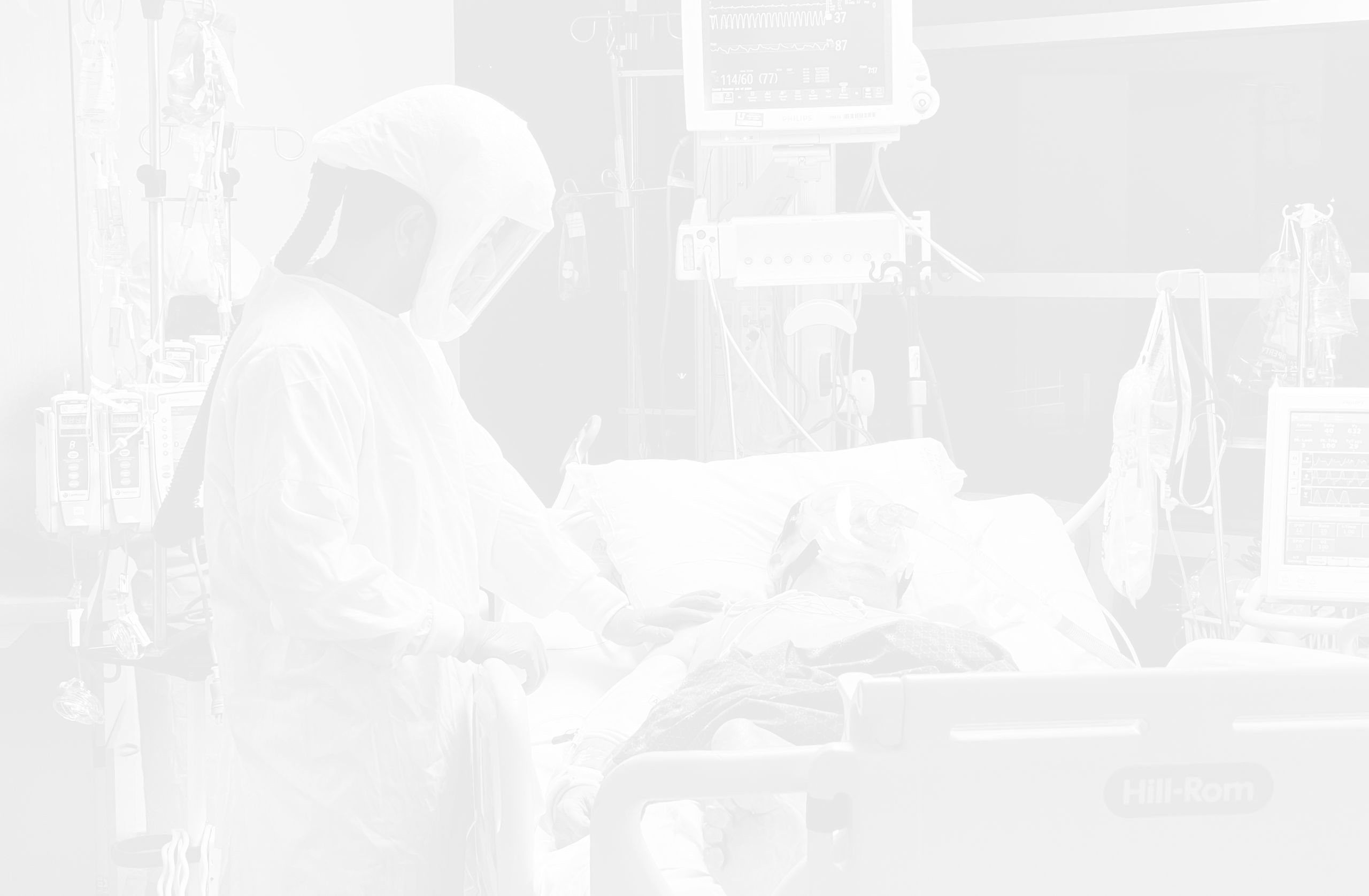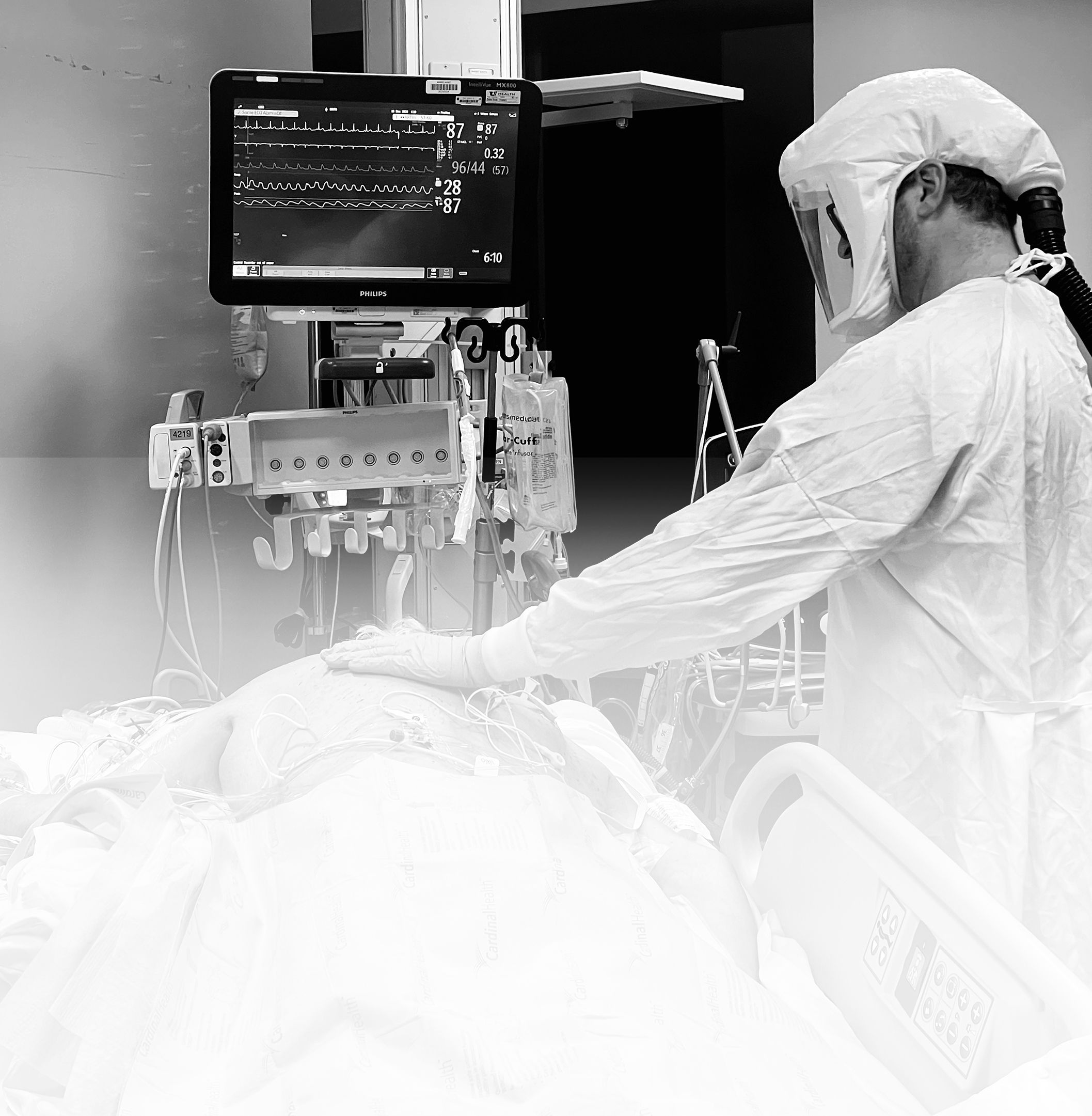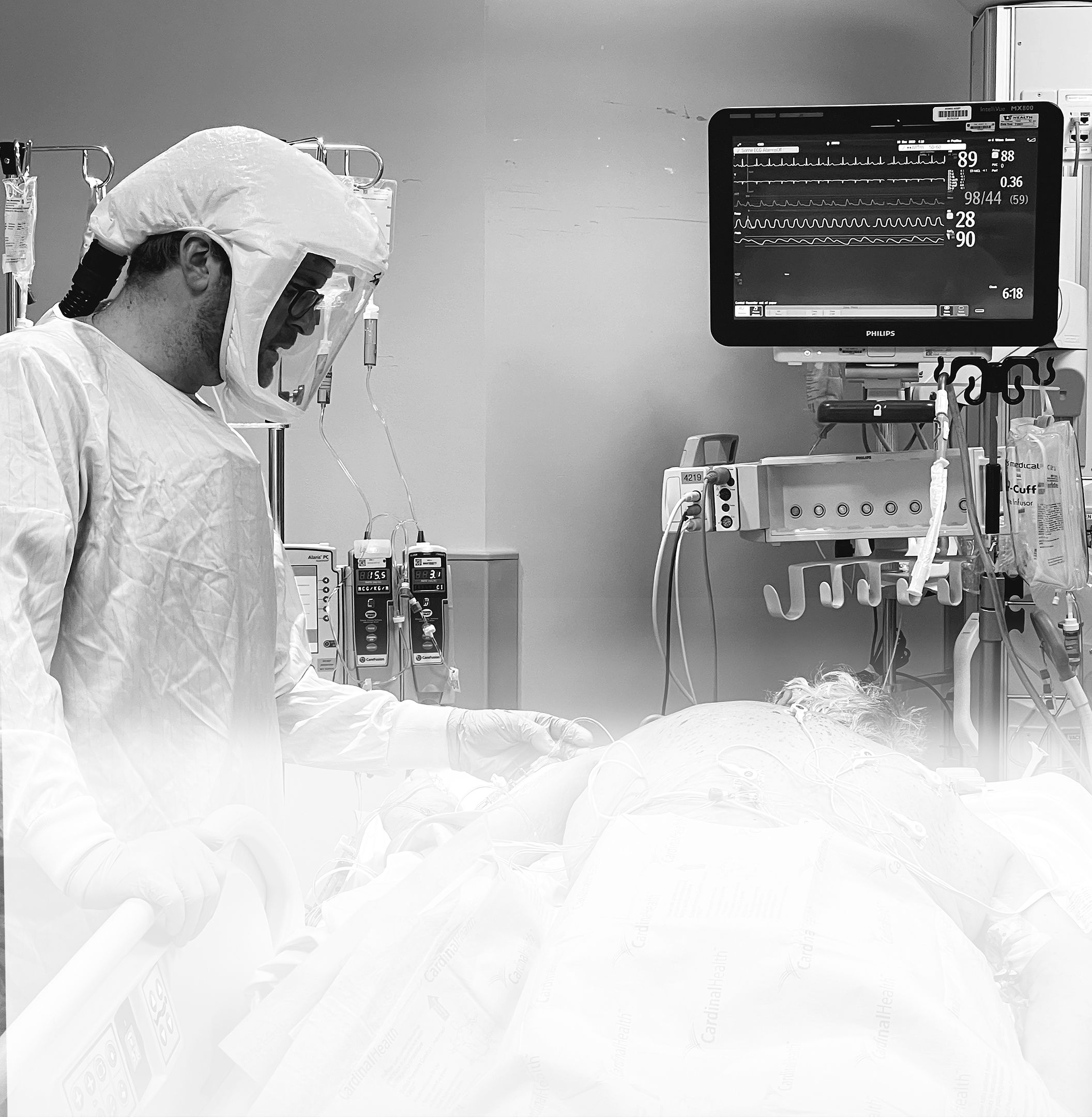 Hooked up to so many machines, the patient is naked, flipped on their belly, their very humanity in so many senses all but denied. A nurse takes a moment to simply connect with a patient. He touches their back with his plastic-gloved hand, conveying—whether they can feel it through the fog of drugs or not—an essential message.