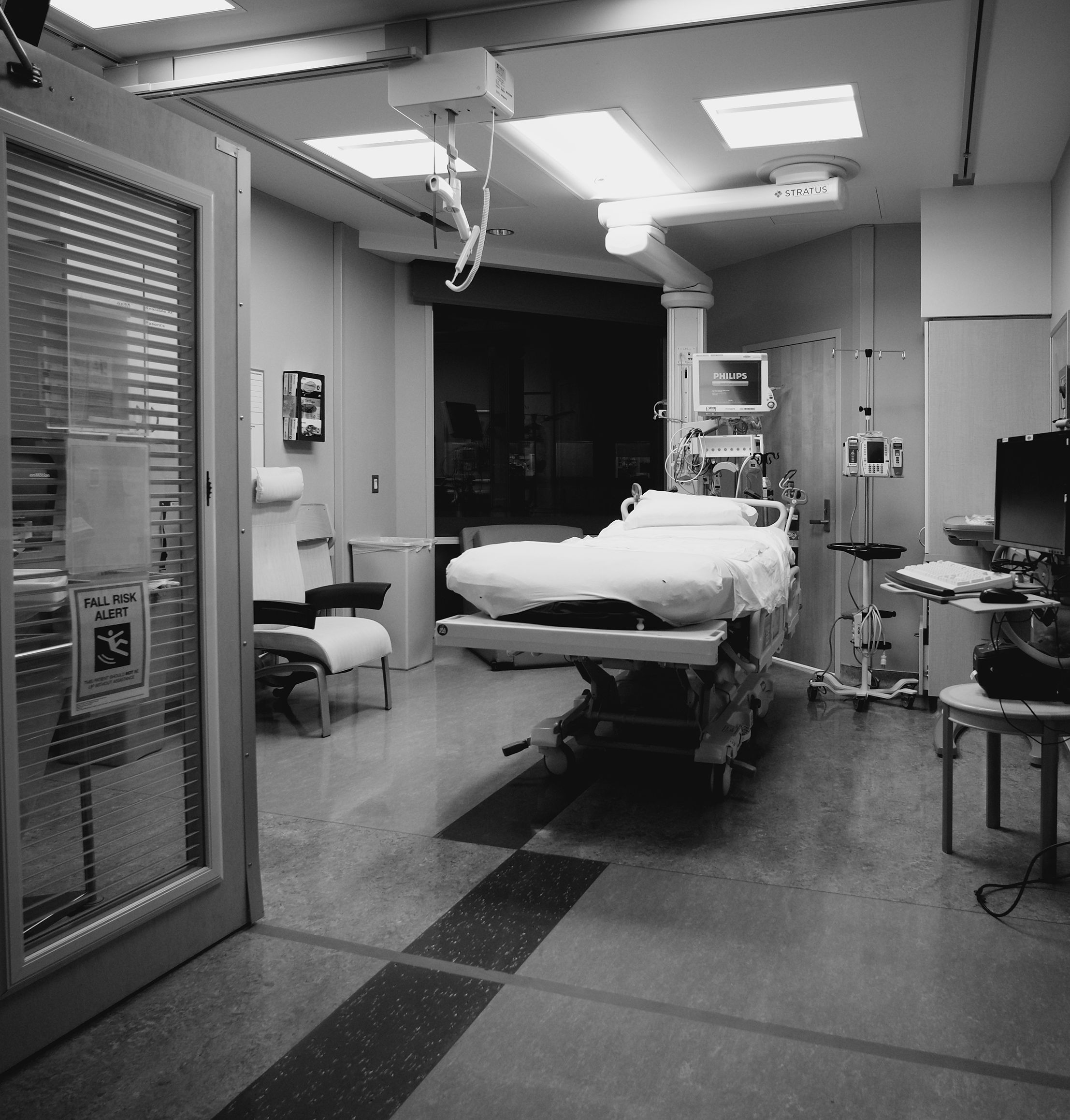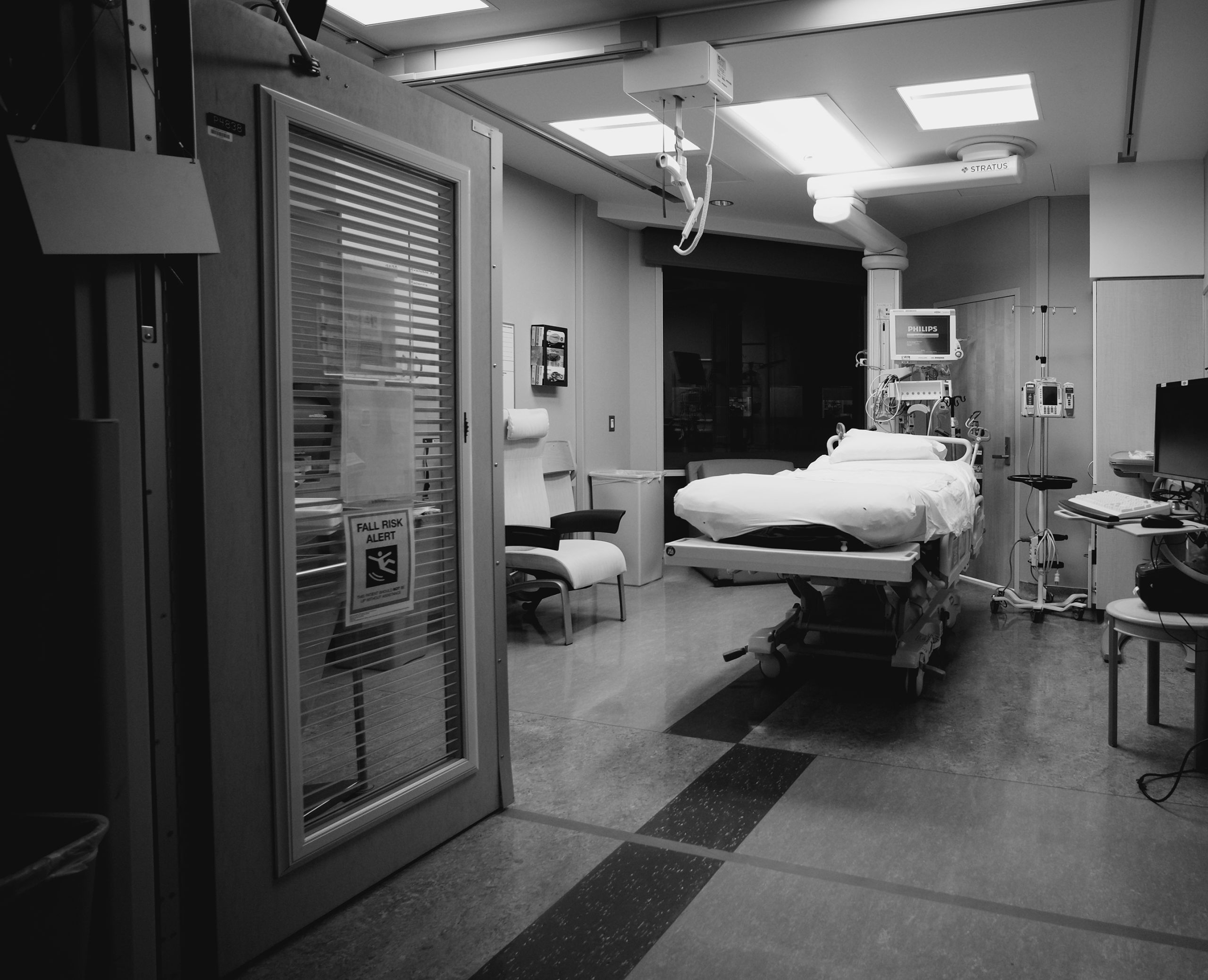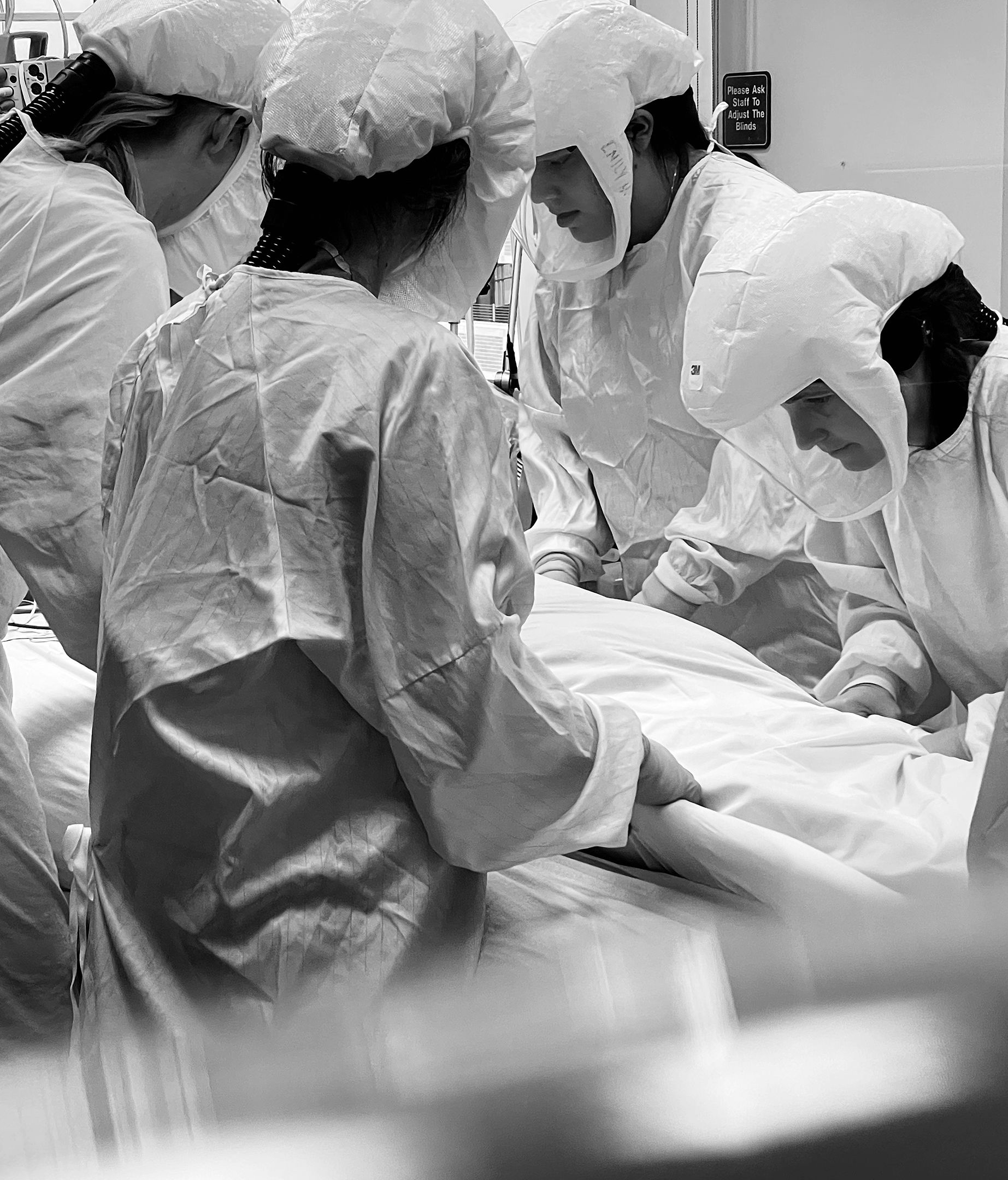 Mostly though, someone can usually answer a call for help, respond to a question, or bring the needed supply. The charge nurse will check in on their nurses and the patient, tapping on the window to ask for a sign—thumbs up, thumbs horizontal, or thumbs down.