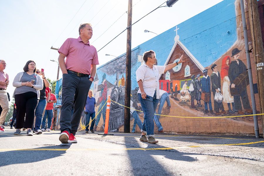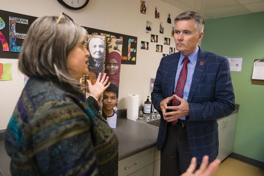 University of Utah President Taylor Randall, PhD, has challenged us to deepen our ties with the community and make a difference in the lives of every Utahn. Here, President Randall listens to Kathryn Kilpatrick, an artist based in Helper, Utah, as she describes the mural she painted in downtown Price to represent Carbon County’s rich and diverse history. Photo by Dave Titensor
